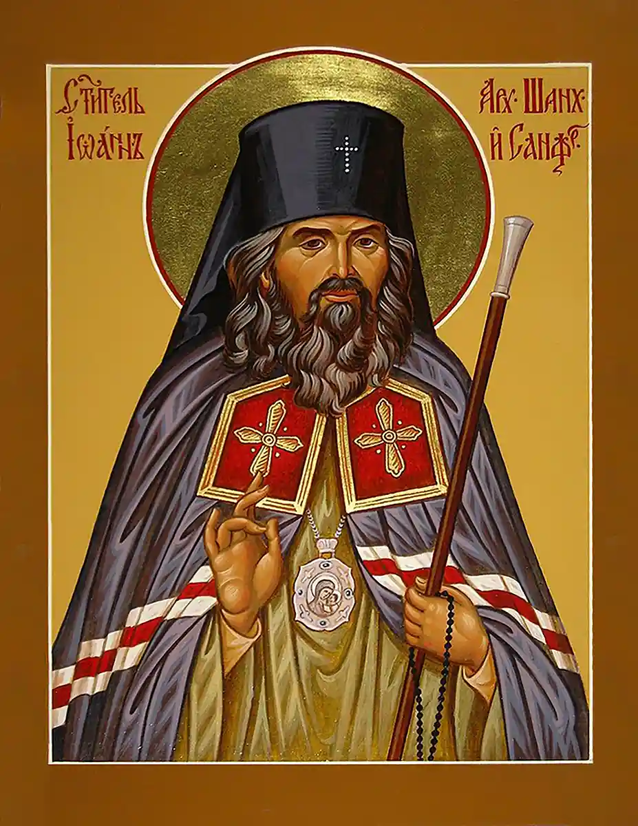 This contemporary icon of the holy hierarch was written by Protodeacon Paul Drozdowski. Straightened and cropped from his original photograph with glare removed from border.